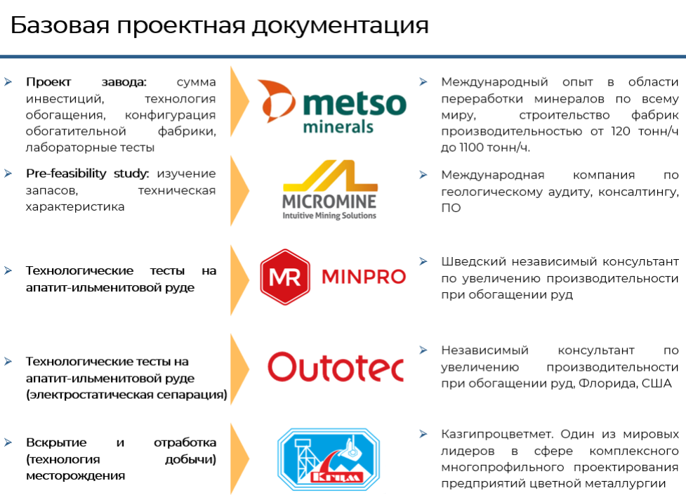 - Final report «Pilot tests on apatite and ilmenite ore», Sala, Sweden, 2008, Metso Minerals (this report reflects the final technological scheme of the deposit’s ore processing, the design of the processing plant and the list of necessary technological equipment, as well as the cost of the plant).